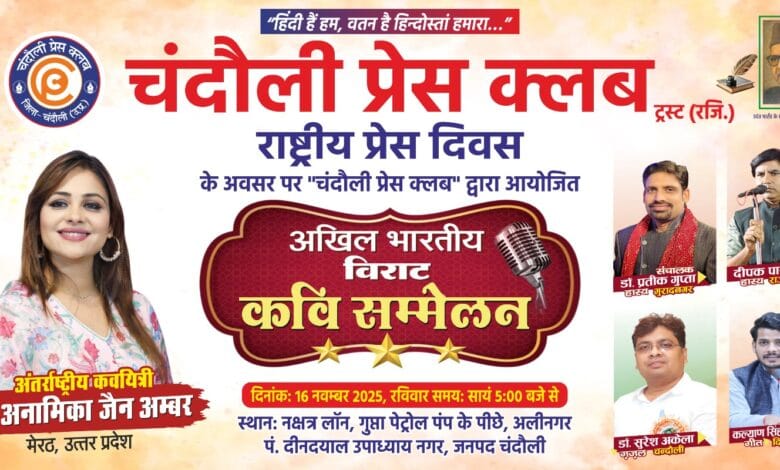 डीडीयू(प्राइम समाचार टुडे )।चंदौली प्रेस क्लब के तत्वावधान में आज 16 नवंबर दिन रविवार को सायं 5 बजे से अलीनगर स्थित नक्षत्र लॉन में विराट कवि सम्मेलन का आयोजन किया जा रहा है। जिसमें विशेष रूप से अंतर्राष्ट्रीय ख्याति प्राप्त कवयित्री अनामिका अंबर अपनी काव्य-गंगा से श्रोताओं को सराबोर करेंगी।इसके साथ अन्य कवि के रूप में डॉ प्रतीक गुप्ता,दीपक पारीक,डॉ सुरेश अकेला,कल्याण सिंह विशाल के उपस्थित में काव्य गंगा की अविरल धारा प्रवाहित होगी।