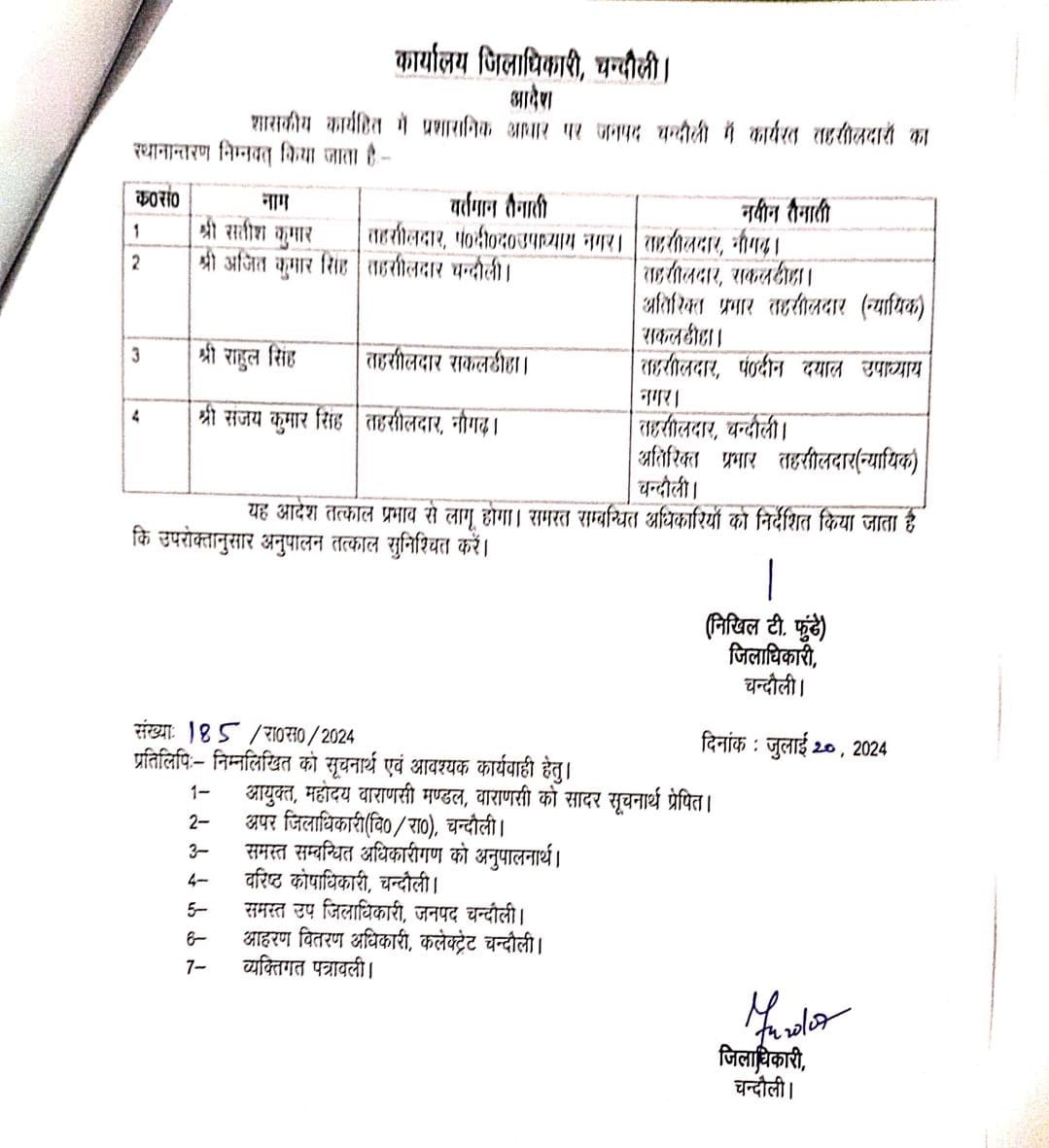 एसपी के बाद डीएम का चला तबादला एक्सप्रेस उपजिलाधिकारी ,तहसीलदार एवं नायब तहसीलदारों का हुआ स्थानांतरण