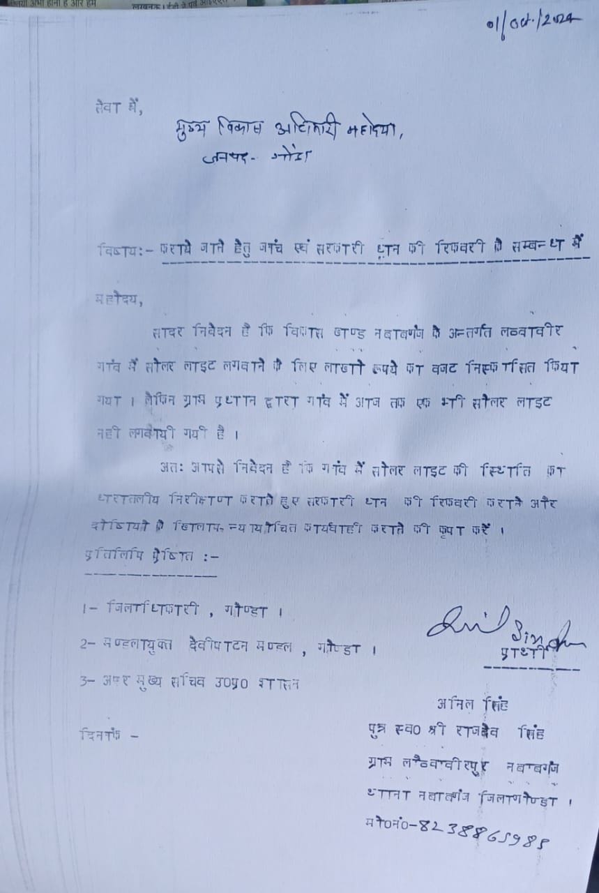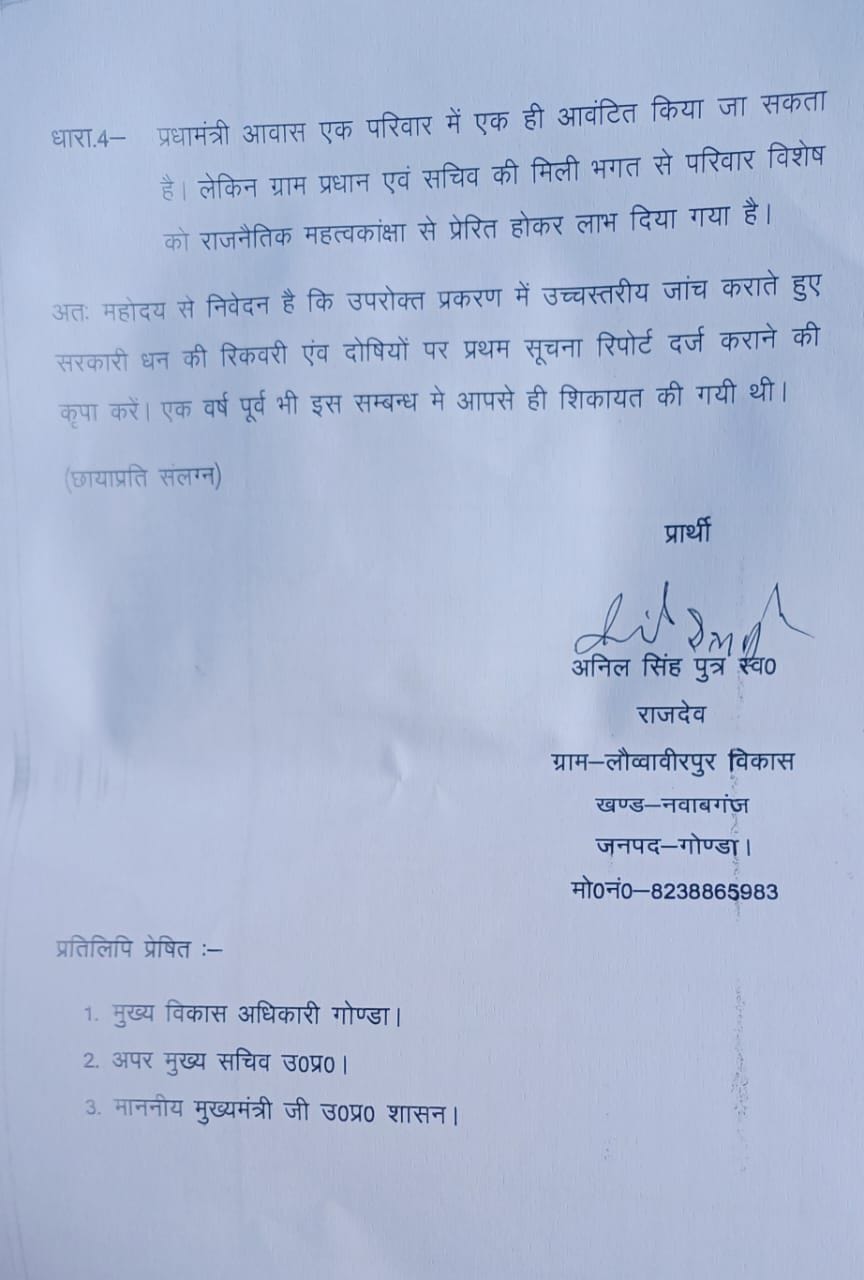 नवाबगंज विकास खंड क्षेत्र के लौव्वाबीरपुर गांव निवासी एक युवक ने गांव में प्रधान मंत्री आवास योजना के तहत आवासों के आवंटन और अन्य विकास कार्यों में धांधली की शिकायत मुख्य विकास अधिकारी, जिलाधिकारी, मंडलायुक्त एवं अपर मुख्य सचिव से की है। युवक ने दिए गए शिकायती पत्र में बताया कि गांव के