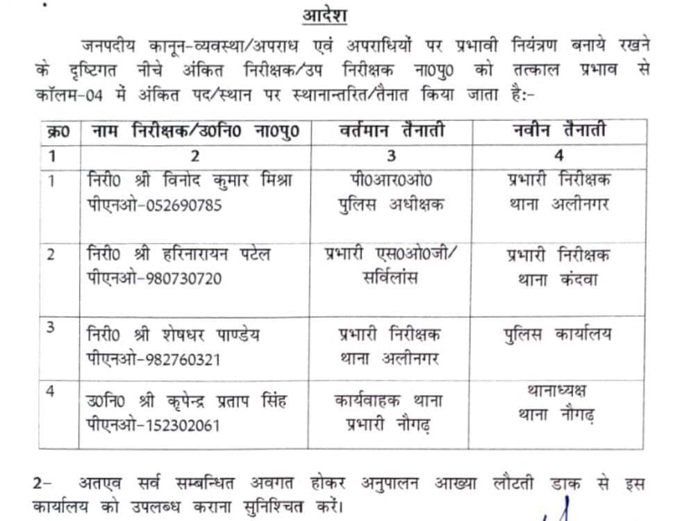 पुलिस अधीक्षक के तबादला एक्सप्रेस का पांचवा फेज पीआरओ बने अलीनगर थानाध्यक्ष तो वही अलीनगर एसओ बुलाए गए कार्यालय, देखें सूची