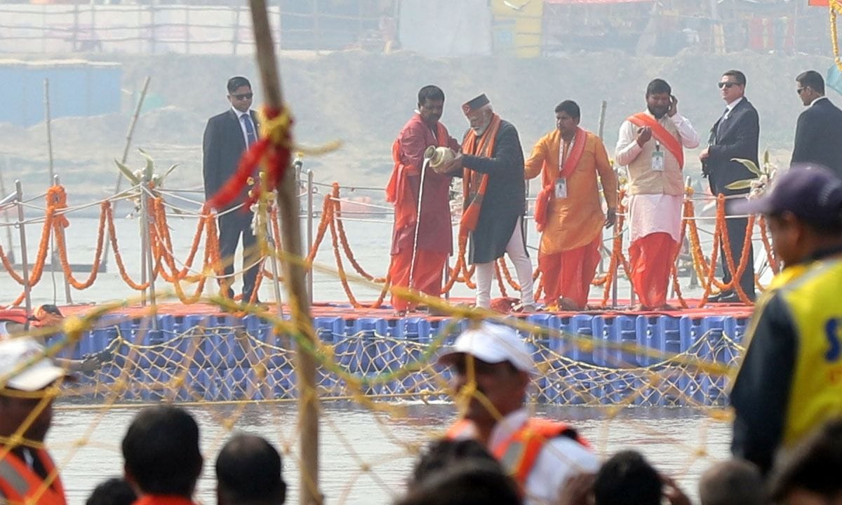 प्रधानमंत्री ने विधिवत किया पूजन अर्चनत्रिवेणी संगम पर डुबकी लगाने से पूर्व प्रधानमंत्री नरेंद्र मोदी ने विधिवत पू्जा अर्चना की। संगम में उतरने से पहले पीएम ने सबसे पहले आस्था के साथ जल को स्पर्श कर आशीर्वाद लिया और फिर सूर्य को अर्घ्य दिया और तर्पण भी किया। संगम स्नान के बाद उन्होंने पूरे विधि विधान से पूजन अर्चन भी किया। काले कुर्ते और
