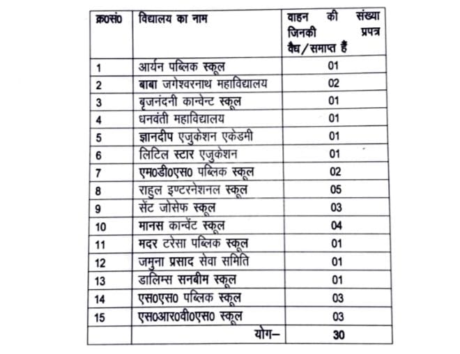 वाहनों के खिलाफ चेकिंग अभियान के दौरान 15 विद्यालयों के 30 वाहनों पर कार्यवाही