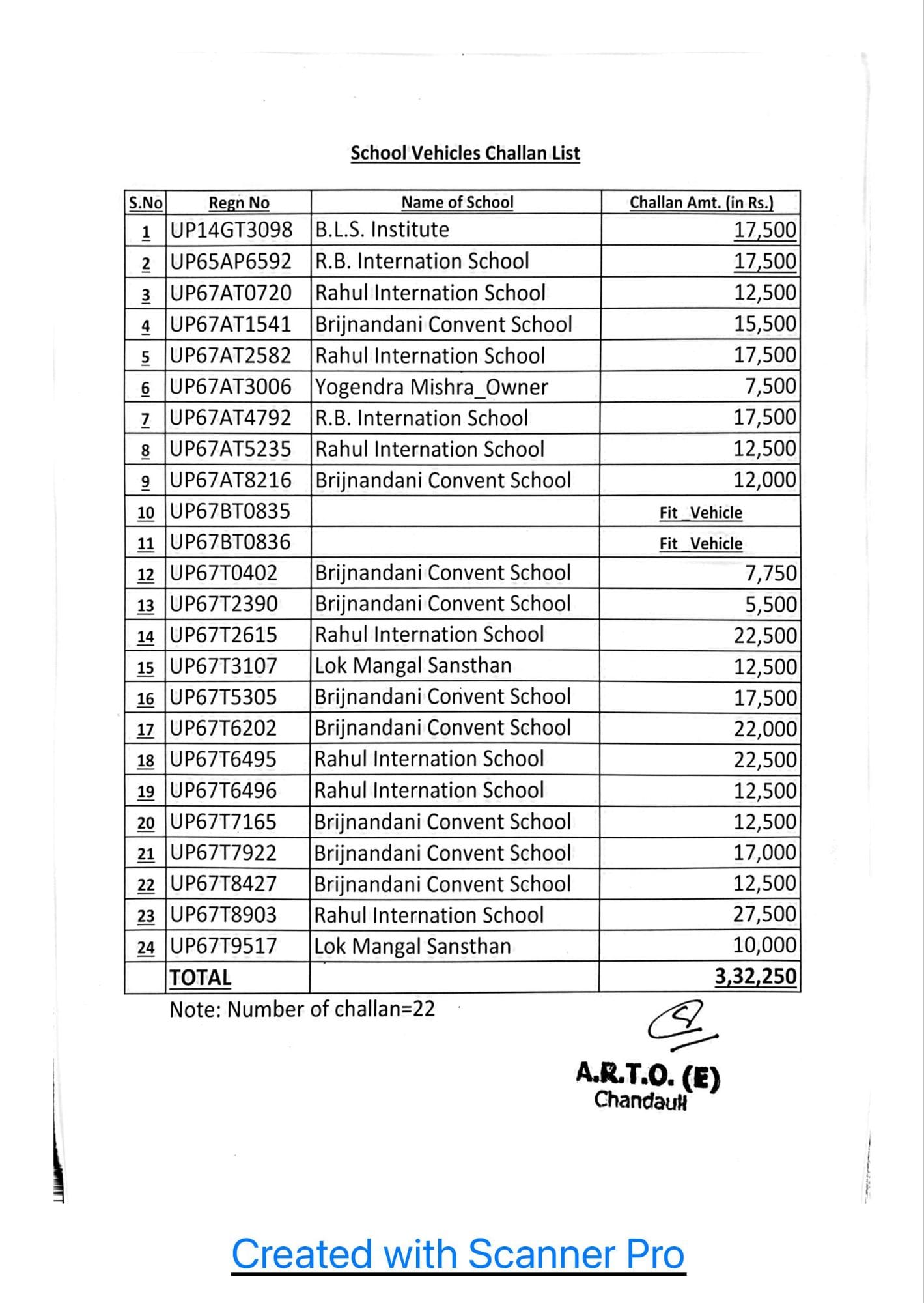 दो दर्जन स्कूली वाहनों का विभिन्न कारणों का हवाला देते हुए 3 लाख 32 हजार 250 रूपया का चालान काटा है। एसडीएम के इस कार्रवाई से स्कूल संचालकों में खलबली मची है। एसडीएम ने चेताया कि नौनिहालों के जीवन से खिलवाड़ करने वाले लापरवाह विद्यालय संचालकों के खिलाफ आगे भी कार्रवाई की जायेगी।