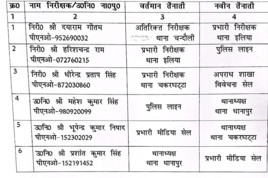 चंदौली प्राइम समाचार टुडे जनपद में पुलिस विभाग के स्थानांतरण का दौर जारी है वहीं पुलिस अधीक्षक आदित्य लाग्हे ने तीन निरीक्षकों सहित 6 उपनिरीक्षकों के कार्य क्षेत्र में बदलाव करते हुये नवीन तैनाती दी बताते चलें कि जनपद में अपराध एवं