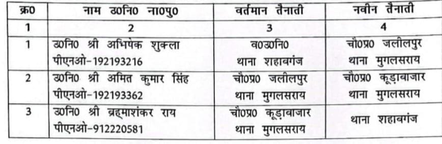 अपराधियों पर प्रभावी अंकुश लगाने को लेकर पुलिस अधीक्षक द्वारा लगातार सार्थक प्रयास एवं कार्यवाही की जा रही है इसी क्रम में तीन निरीक्षकों सहित 6 उप निरीक्षक के कार्य क्षेत्र में बदलाव करते हुए नवीन तैनाती दी गई है इसमें धानापुर एसओ की लगातार मिल रही शिकायत पर कार्रवाई करते हुए उन्हें लाइन हाजिर कर दिया गया है ।