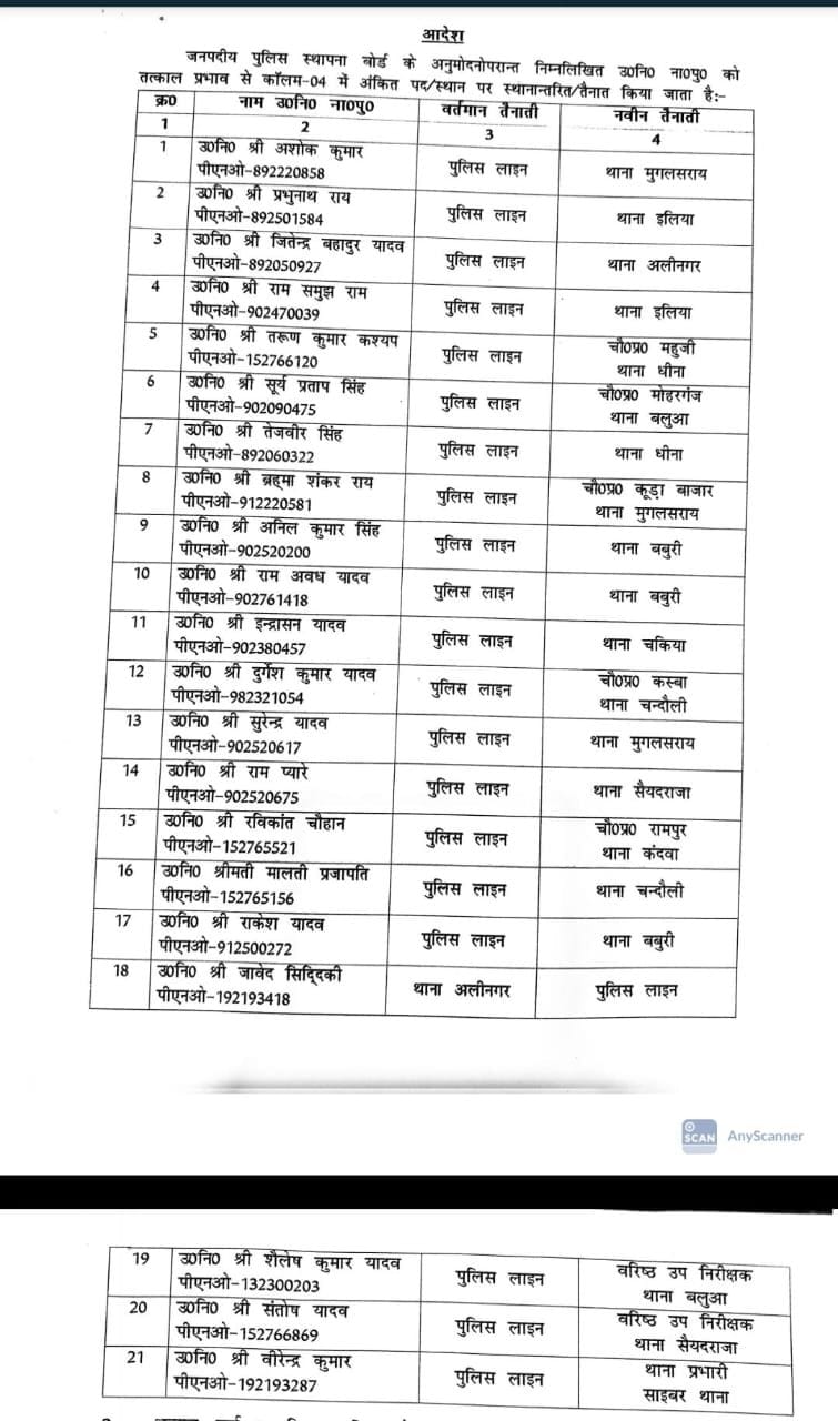 पुलिस से प्राप्त जानकारी के अनुसार पुलिस लाइन में तैनात 20 उप निरीक्षकों को जनपद के विभिन्न थानों में तैनाती दी गई है वही दो उप निरीक्षकों को प्रभारी उप निरीक्षक का दायित्व तो पांच उप निरीक्षकों को चौकी प्रभारी बनाया गया है इसके साथ ही जनपद में तैनात 22 आरक्षियों को भी स्थानांतरण के साथ नवीन तैनाती दी गई है
