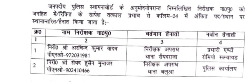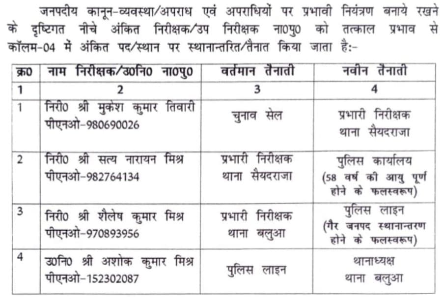 स्थानांतरण में थाना सैयदराजा से अरविंद कुमार यादव को प्रभारी एंटी रोमियो तो थाना बलुआ से सैयद हुसैन मुंतजर को पुलिस कार्यालय, मुकेश तिवारी चुनावी सेल से नई जिम्मेदारी थाना सैयदराजा वहीं थाना सैयदराजा सत्यनारायन मिश्र को 58 वर्ष की आयु पूर्ण के कारण पुलिस कार्यालय स्थानांतरित किया गया शैलेश कुमार मिश्रा को गैर जनपद स्थानांतरण के फल स्वरुप पुलिस लाइन तो पुलिस लाइन से अशोक कुमार मिश्रा को थाना बलुआ का कार्यभार सौपा गया